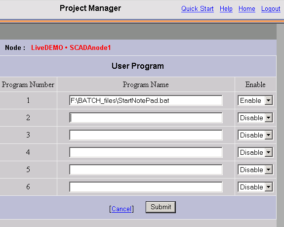 The SCADA node can call a custom User Program or any third party program including *.exe and *.bat files. These 3rd party programs are called when the SCADA Node starts.